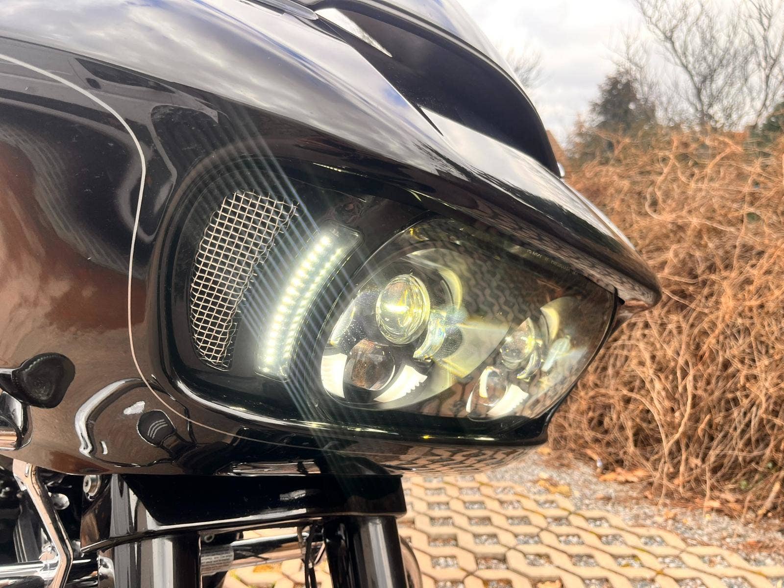 Motocykl je osazen kompletně LED osvětlením s přídavnými pozičními světli v masce.